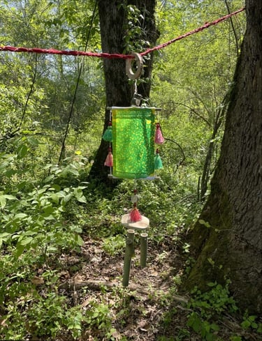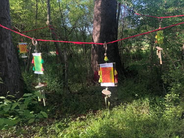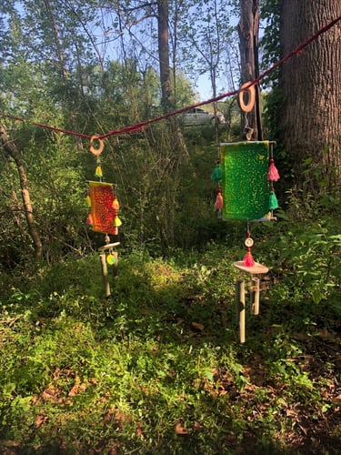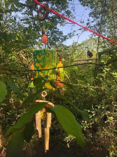 This was an installation I did for a drawing class. They are batik banners decorated with handmade tassels and bamboo chimes. They were strung around a family of large poplars that are living in a forgotten area between roads and developed land. I called them "protection sigils" as they were intended to mark the importance of the area.