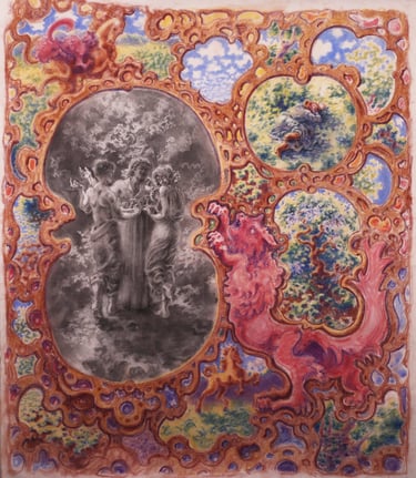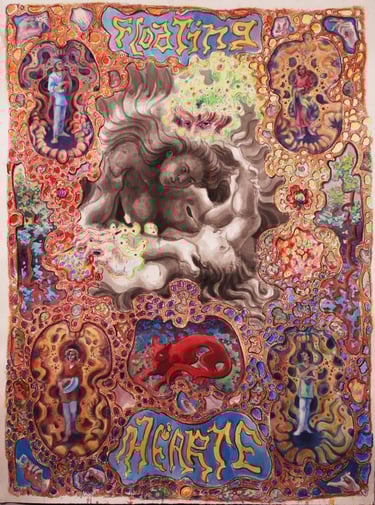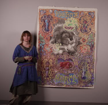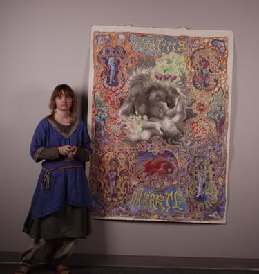 Here are two sister pieces that are supposed to follow cat with no stomach, but were a little too far removed temporally to work together as a trio. In order they are The Third Muse and Floating Hearte. The latter is large scale as well, I think it's over 4' but I have an unfortunate habit of just ripping off whatever size paper feels right and starting to paint, so I don't know the exact size. Here is a picture of me next to it for reference.