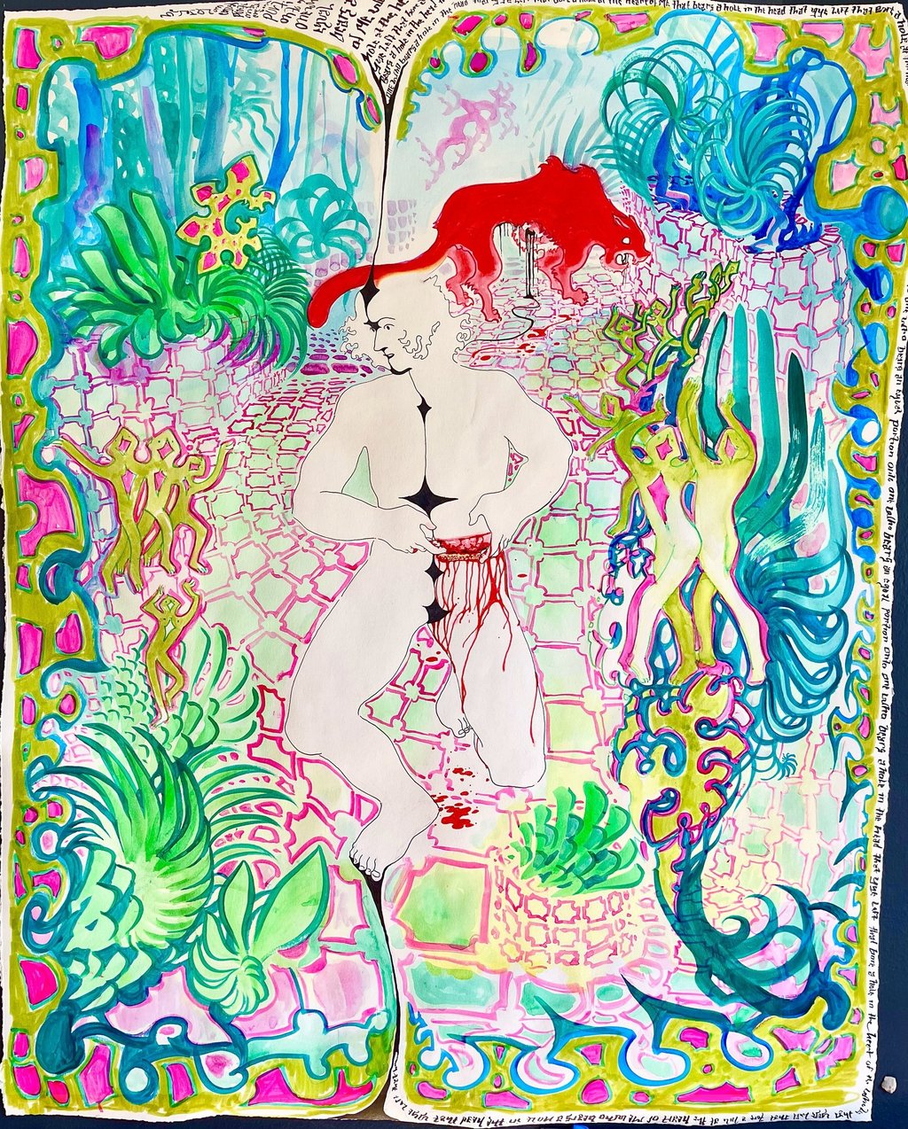 the figure is from imagination but the pose was practiced meticulously beforehand. I started with very clean line art and a perspective grid and then let everything dissolve as I moved away from the figure.