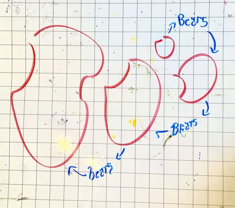 the Bear may be the golden ratio, but I haven't been able to confirm this. It's easy to observe that when dividing a canvas into the first Bear, the marks will approach the golden ratio between the top and bottom of the rectangle. Things get more complicated after that. When just following one's instinct for beauty, it's hard to tell which new marks are bearing on old marks. When painting, one is rarely seeing the whole composition at once. Therefore when painting each mark in bear to the last ones, the marks take on a fractal effect as the painter goes into smaller details, since the same rule is used throughout the painting.